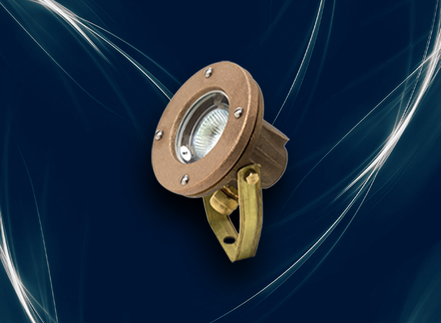 Proyector sumergible hecho en bronce fundido con horquillas de fijación, para lámparas dicroicas y plaquetas led monocromáticas o RGB.